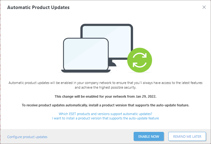 Ako se prisetite naše čestitke za Novu 2022., primetićete jednog mladog bradonju, naočit momak, drag kao Deda Mraz, koji kroz osmeh izgovara “automatski upgrade!”. Na šta je to mislio, a da je toliko važno da ga u čestitku stavlja? Ko ga je upoznao, zna da Vlada ne obećava bez pokrića. S druge strane, šta bi svaki ESET admin mogao lepše da poželi, nego da AV softver sam sebe održava? Vlada je poželeo želju, svi smo držali palčeve i bili strpljivi, a dobri duh sa severa potrudio se da dobijemo šta zaslužujemo.