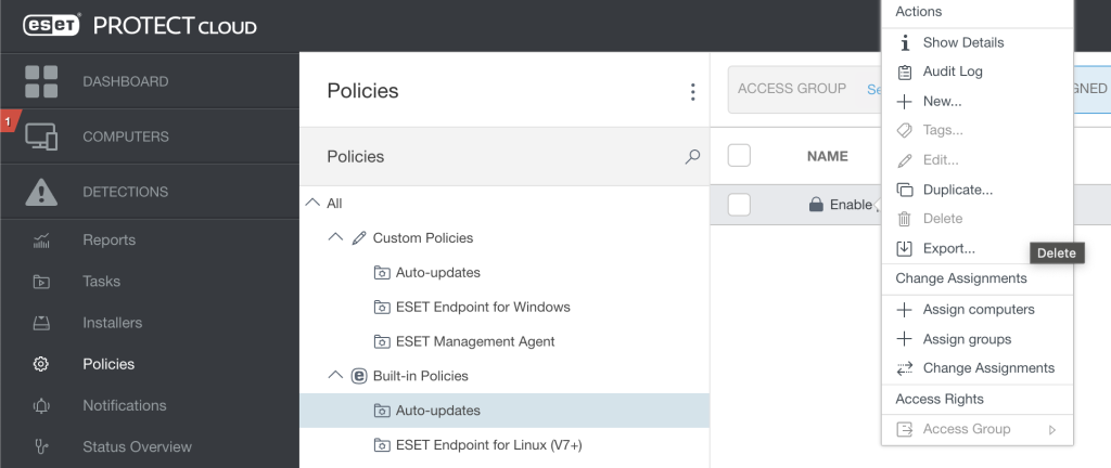 Auto-update polisa dolazi sa ESET Protect serverom 9 i katančić pored njenog naziva znači da nju ne možete da obrišete ili menjate, ali možete da upravljate njenom primenom nad endpoint stanicama. Ako klikom na nju kroz Change assigment opciju uklonite grupe ili računare na koje se primenjuje, ona gubi svoju ulogu.