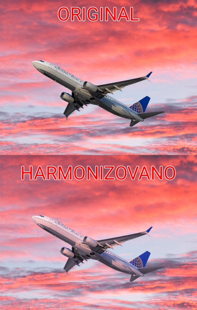 Postupak je prilično jednostavan. Slike koje treba uklopiti stavimo u isti dokument kao slojeve. Gornji sloj je onaj koji treba da se uklopi u atmosferu donjeg, pa kada otvorimo filter Harmonize potrebno je da izaberemo koji je sloj onaj koji će dati atmosferu. I… Ostalo je automatika. Gornji sloj se harmonizuje sa bojama donjeg i sve izgleda odlično. Postoje kontrole za intenzitet primene harmonizacije, kao i za balans boja, zasićenost i svetlost, što je sasvim dovoljno da se uklapanje boja uradi kako nam odgovara.
