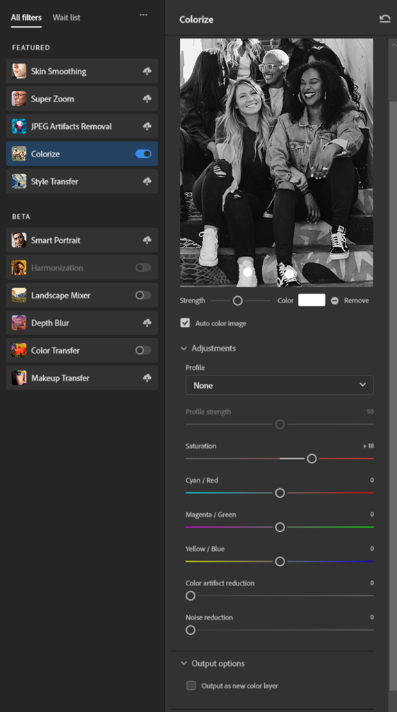 Ovaj filter postoji od kada su se pojavili Neuralni filteri, ali se konstantno unapređuje. Razlog leži u tome što je to, verovatno, najupotrebljivaniji filter u ovoj kolekciji. Svi imamo razne crno-bele fotografije koje bismo želeli da pretvorimo u kolorne, sa rezultatom koji bi izgledao verno. Prve verzije ovog filtera su davale rezultate bliske izbledelim kolornim fotografijama i nekako nisu delovale verno.