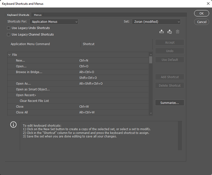 I na kraju, prečica za podešavanje prečica. Photoshop, Illustrator i InDesign imaju mogućnost podešavanja prečica tj. dodeljivanja prečica opcijama koje ih nemaju, kao i promenu postojećih. U Photoshopu i Illustratoru se ova opcija poziva prečicom Shift+Alt/Opt+Ctrl+Cmd+K, dok u InDesignu ne postoji prečica za ovu opciju, a ova pomenuta prečica poziva opcije Clipping Patha (što je verovatno zaostavština QuarkXPressa).