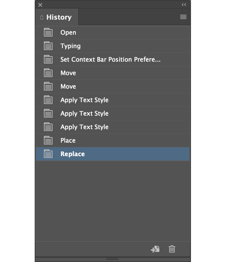 Photoshop odavno ima History mehanizam i odgovarajući panel, Illustrator ga je dobio prošle godine i čekali smo da se to desi u InDesignu. Kao i u Illustratoru, nema mogućnost pravljenja snimka stanja (Snapshot), ali sve ostalo radi. U odnosu na History u Illustratoru ima jednu dobru i jednu loš osobinu. Dobra je da History „neograničen”, tj. da prati stanja od trenutka otvaranja dokumenta, a loša je da to radi samo ako je dokument sačuvan tj. ako postoji na nekom prostoru za skladištenje. Ovo će nas terati da odmah pri otvaranju prvo imenujemo i sačuvamo dokument, pa onda krenemo sa radom. Pošto u Photoshopu i Illustratoru to nije slučaj, nadam se da će korisnici da “dignu dreku” i da će se ovo promeniti.