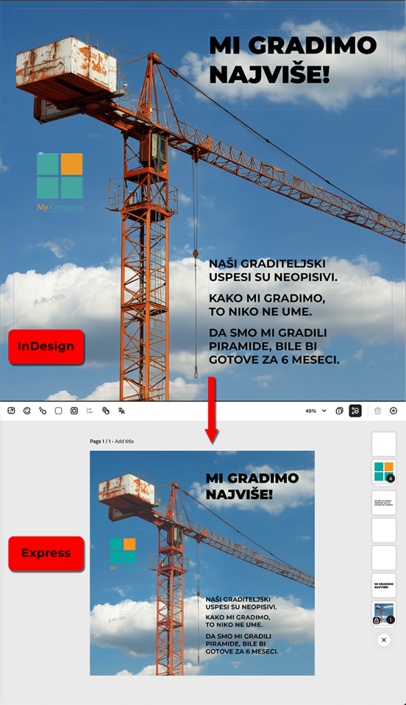 Adobe Exprees je sve moćniji i sve više stvari se bazira na njegovim mogućnostima. Zato i ne čudi nova mogućnost da se dokument direktno iz InDesigna prebaci u Express. Kako Express nudi obilje opcija za generisanje različitih sadržaja, neki dizajn započet u InDesignu se može lepo “obogatiti” kroz Express. Ovo radi prilično glatko i lepo, nastavak rada na dokumentu je potpuno prirodan.