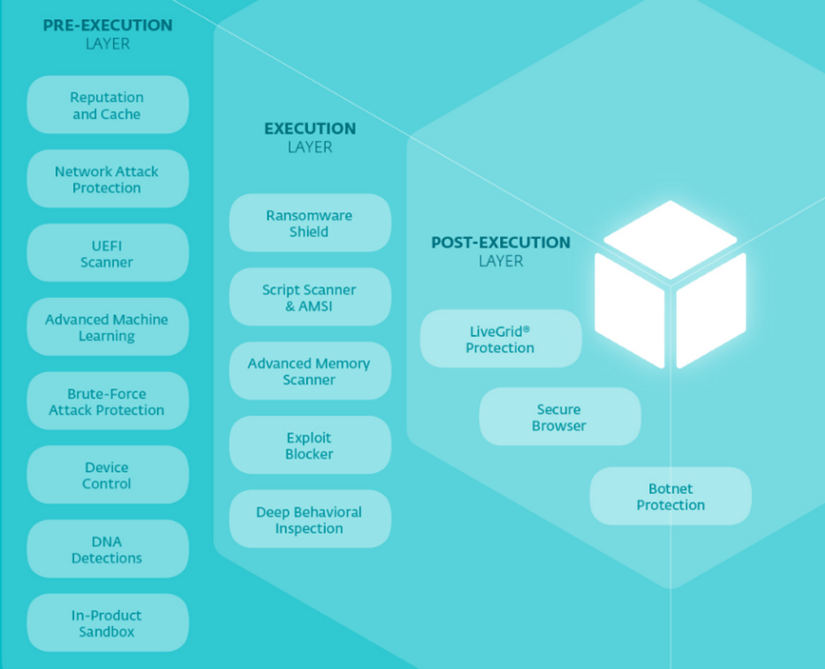 ESET Protect Essentials (on-premise ili cloud) paket, koji se najčešće razmatra jer je najpovoljniji, u svojoj osnovi sadrži program za zaštitu pod imenom ESET Endpoint Antivirus. To je bazni, osnovni ESET-ov proizvod iz kojeg su izvedeni svi ostali, napredniji ili prilagođeni određenim zadacima, kao što je npr. zaštita servera. ESET Endpoint Antivirus u sebi sadrži ne jedan već, zajedno sa Antiphishing modulom, 9 tehnologija zaštite koje vas brane od ransomvera. Svaki od modula ima određenu ulogu, zavisno od faze napada kojoj ste izloženi. Čemu svaki modul služi možete videti ovde.