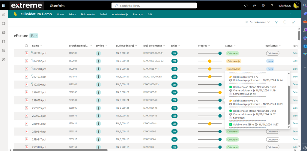 U praksi, to znači da eLikvidatura putem aplikativnog interfejsa komunicira sa SEF-om i u realnom vremenu preuzima fakture i njene priloge, upisuje metapodatke dostupne u XML fajlu i evidentira sve promene. Uz to, zahvaljujući mehanizmu fleksibilne matrice dodeljivanja prava pristupa i odobravanja, omogućava brzo interno odobravanje/odbijanje kroz željeni broj nivoa i prosleđivanje te informacije nazad na SEF. Obezbeđen je, dakle, zaokružen proces i potpuna dvosmerna komunikacija.