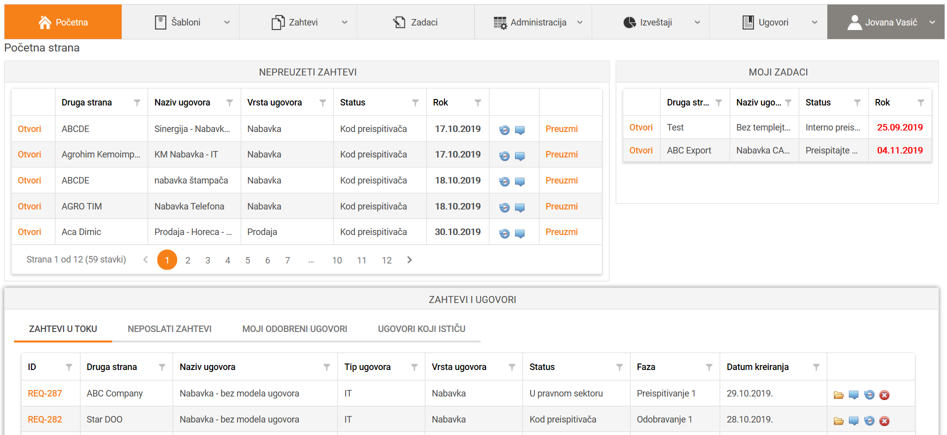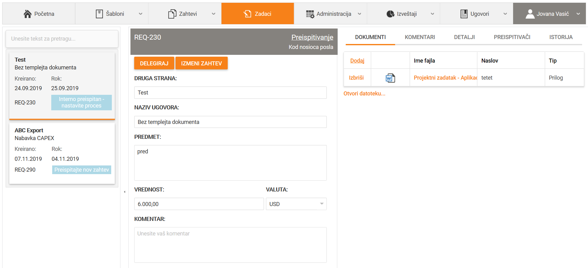 U inbox-u gledam e-mail dobavljača u kome mi je po dogovoru dostavio njihov standardni predlog ugovora s prilozima na moj zahtev. Otvaram Web aplikaciju, odlazim na formu za novi zahtev, biram tip ugovora, biram drugu stranu iz baze partnera, unosim ostale važne metapodatke, prilažem primljene dokumente i pokrećem proces.
