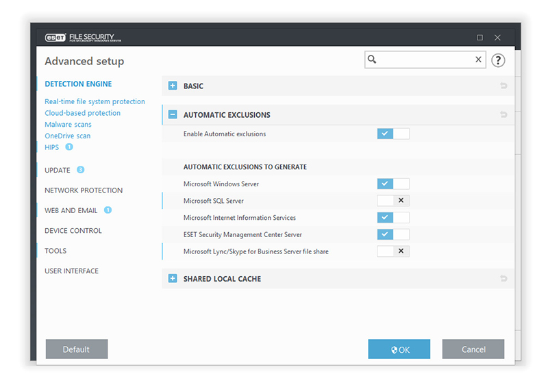 Pored unapred pripremljene liste aplikacija i foldera koje korisnik želi da izuzme od skeniranja, File Security će u toku instalacije kreirati i preporučenu, automatsku listu izuzetaka za detektovane Windows servise. U većini slučajeva su automatski izuzeci sasvim dovoljni za neometan rad servera. Dodatni izuzeci se mogu definisati po putanji, izvršnom procesu, heš vrednosti, pa i samoj detekciji ukoliko drugačije nije moguće.