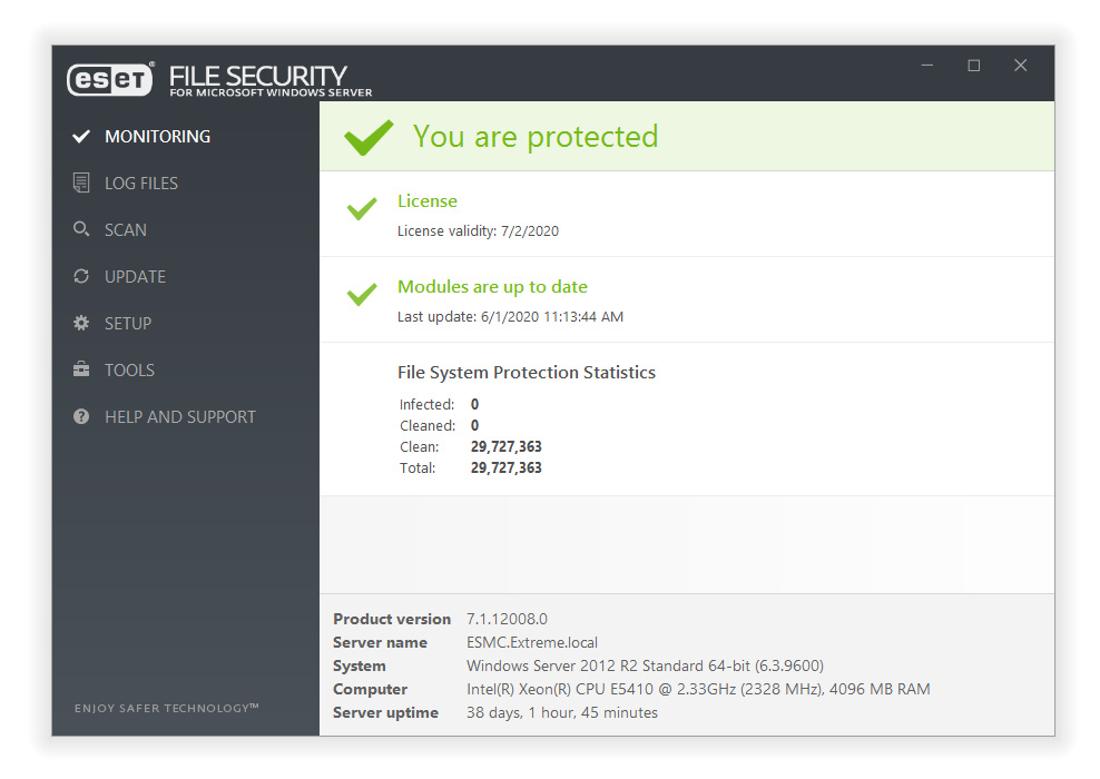 Uvođenje Ransomware Shield modula u verziji 7.1 dovoljno govori o veličini te globalne pretnje. Advanced Memory Scanner bavi se srodnom tematikom i zaslužan je za većinu ransomware detekcija. UEFI Scanner će prijaviti hardverske propuste na koje treba obratiti pažnju, Network Attack Protection i Botnet Protection dodatno će pročešljati mrežni saobraćaj, a Exploit Blocker štiti server od poznatih ranjivosti operativnog sistema i aplikacija. Kao i ranije, Device Control neće dozvoliti priključivanje nepoznatih uređaja na server.