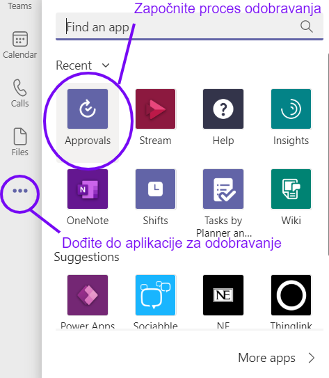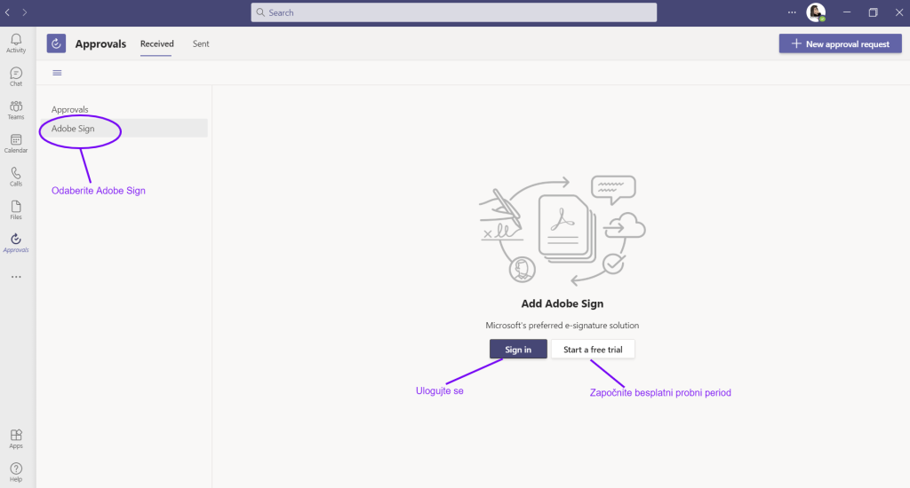 - Otvorite aplikaciju za odobrenje (Approvals). Najpre pokazivačem miša dođite do tri tačke u Microsoft Teams-u (…), potom kliknite na iste, pojaviće vam se prozor, unutar koga se između ostalog nalazi aplikacija za proces odobravanja (Approvals). Nakon što klikom uđete u aplikaciju za odobravanje, ponuđeno će vam biti da se prijavite ili započnete besplatni probni period (14 dana) za Adobe Sign.