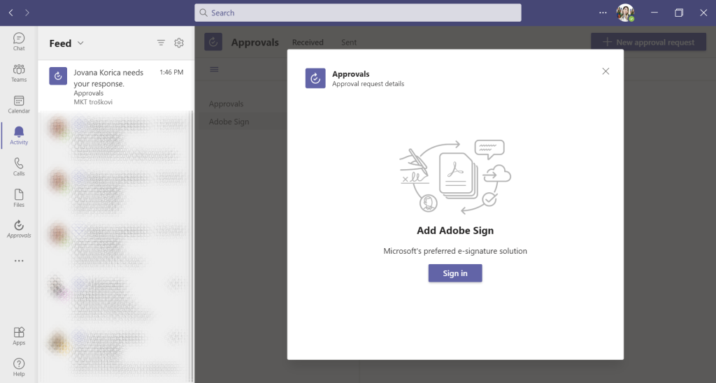Ukoliko koristite Microsoft Teams u režimu “javni pregled“, već sada možete da isprobate aplikaciju Adobe Sign unutar opcije Odobravanje u Microsoft Teams-u. Integracija Teams-a i Adobe Sign-a pruža neke nove mogućnosti u procesu odobravanja: potpisivanje dokumenata elektronskim putem, ali tako da obe strane budu sigurne kako je dokument izmenjen tokom procesa odobravanja.