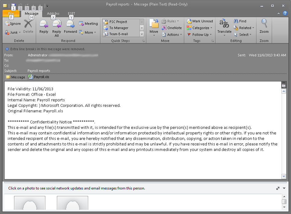 Hakerima je lagan posao da u SPAM poruci adresu pošiljaoca (“From”) zamene sa vama poznatim kontaktom, ukoliko je njegov računar inficiran ili je ostavljao mail adresu na sumnjivim veb sajtovima. Ukoliko primite poruku sa poznate adrese, a niste očekivali tu poruku ili njen sadržaj, kontaktirajte pošiljaoca usmeno (telefon, mail, skype…) i proverite da li je zaista poslao. Ukoliko ste u poslovnom okruženju i sumnjate u validnost neke poruke, pošaljite je IT odeljenju na proveru uz prethodne konsultacije o načinu slanja. Ako ne možete da stupite u kontakt sa IT-jem, proverite svojstva linkova (desni klik, properties) i uverite se da vode na legitimne stranice. I da ponovim, najsigurniji ćete biti ukoliko sadržaj poruke ne otvarate uopšte.