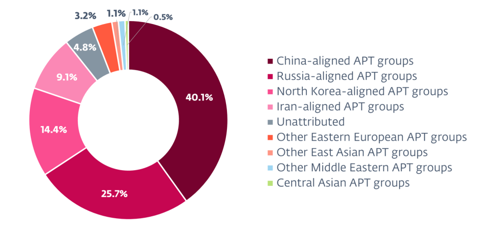 Najaktivnije su bile kineske APT grupe. Mustang Panda je ciljao evropske vladine i transportne institucije pomoću Korplug malvera i zaraženih USB-ova, dok je grupa DigitalRecyclers koristila privatne VPN mreže i backdoor alate kao što su RClient i HydroRShell.