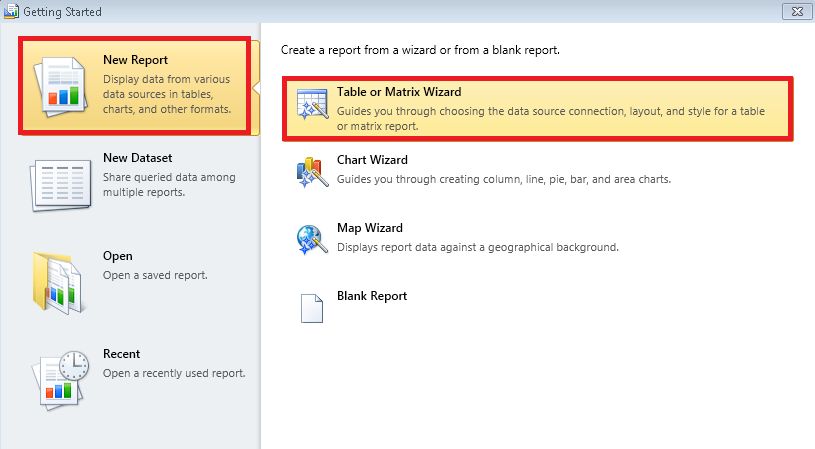 Sa leve strane odabraćemo opciju New Report a sa desne Table or Matrix Wizard.